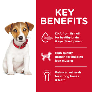 Puppies have unique nutrition needs, and your young small breed dog is no exception. Hill's Science Diet Small Bites Puppy dry food is carefully formulated for the developmental needs of little pups while they grow into mature small dogs, so they get the best start in life & grow to their full potential. Give your tiny canine friend delicious chicken flavour in a small kibble size that contains DHA from fish oil for healthy brain and healthy eye development, rich protein for lean muscle growth, and balanced minerals to promote strong bones and strong teeth. This small dog food made with natural ingredients is formulated with decades of cutting-edge research to be a great-tasting meal puppies can truly enjoy.