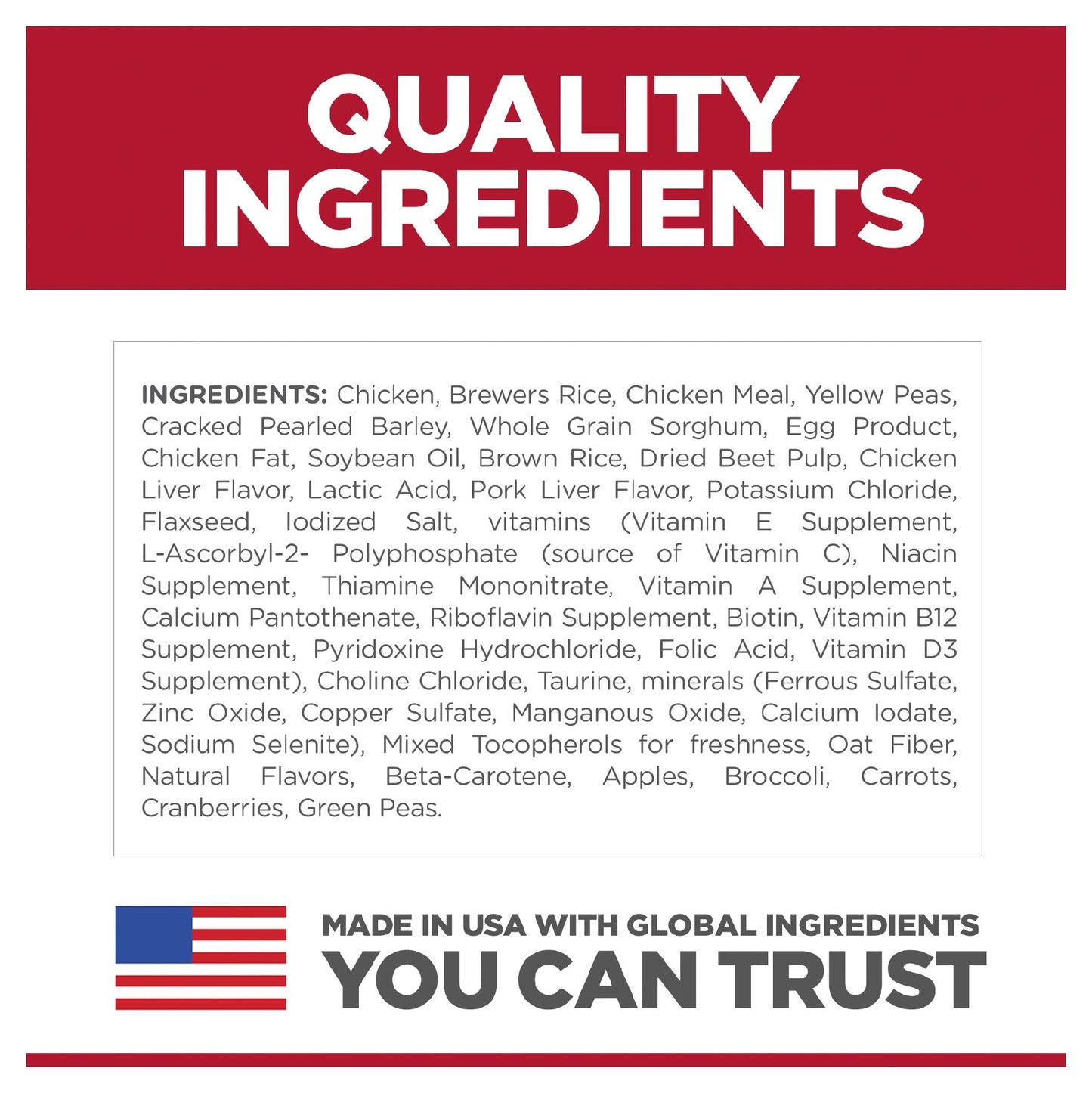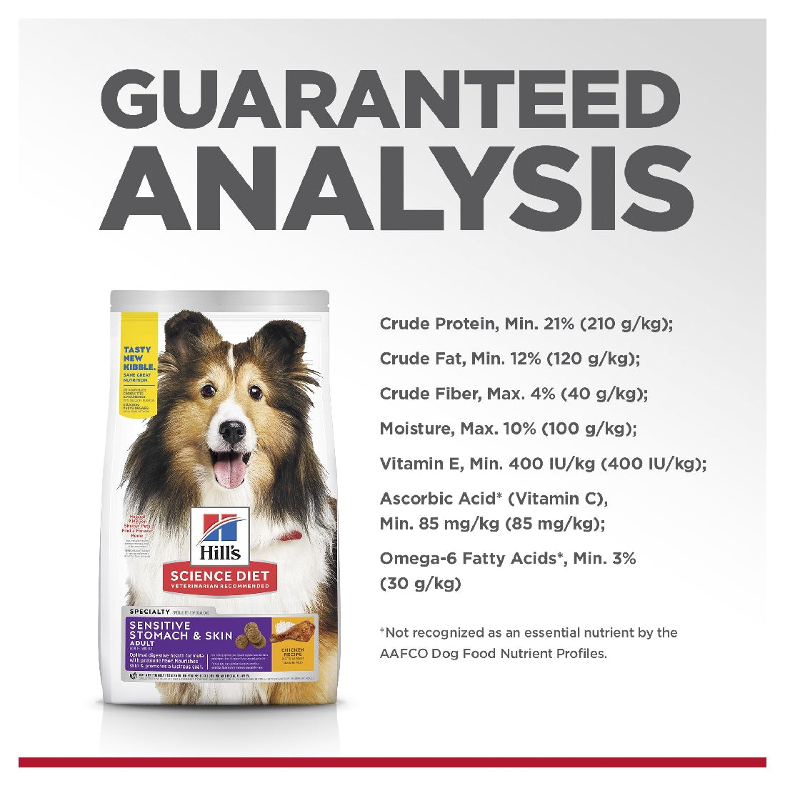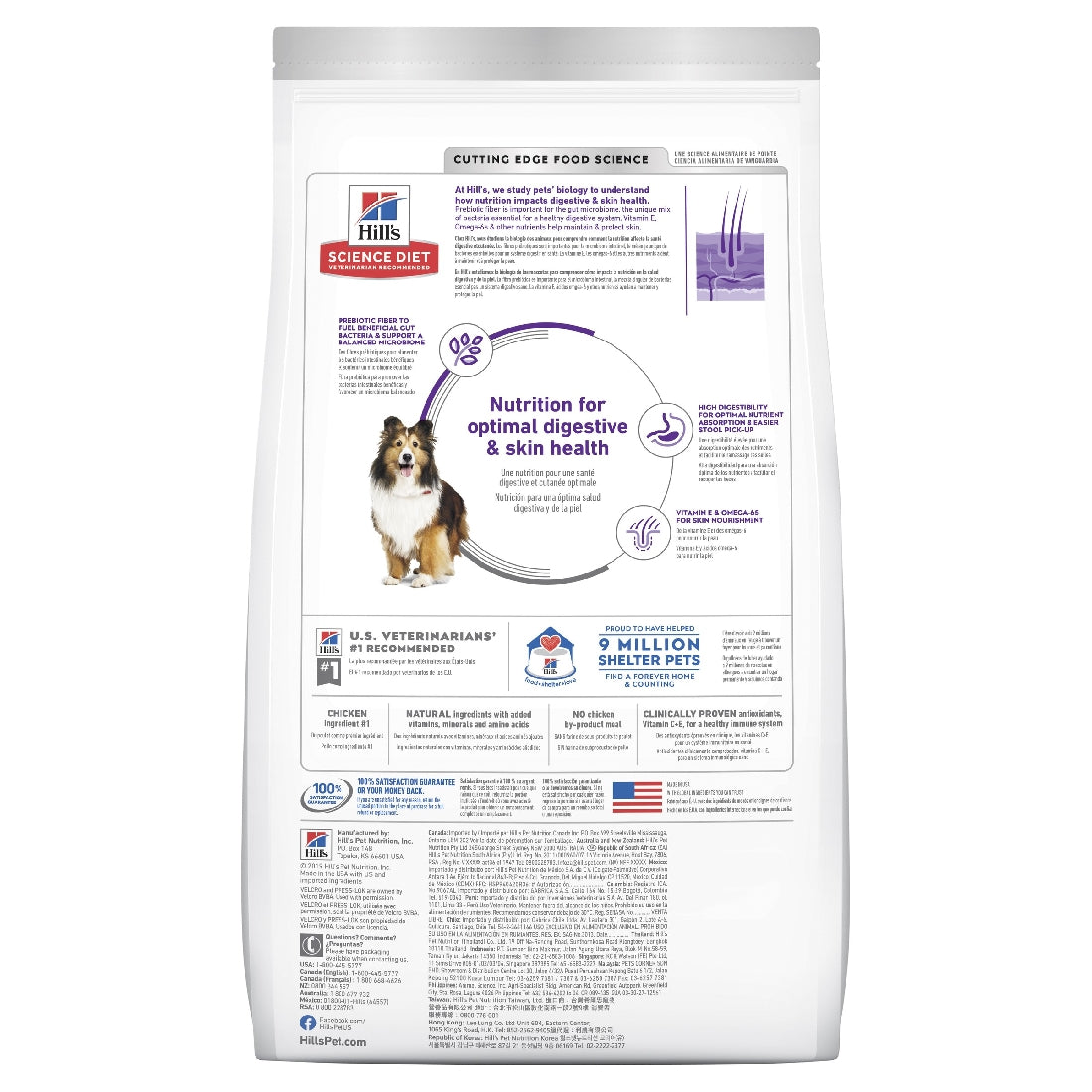Your grown dog wants to feel as good as he or she looks. Hill's Science Diet Sensitive Stomach & Skin Adult Dog Food is specially formulated for optimal digestive health. This dog food for sensitive stomachs uses prebiotic fibre to fuel gut bacteria and support a balanced microbiome. In addition, this dry dog food made with natural ingredients also provides an excellent source of vitamin E and Omega-6 fatty acids to nourish your dog's skin, and help maintain a healthy, shiny coat. This digestion care food is formulated with decades of cutting-edge research to be a great-tasting meal adult dogs can truly enjoy.