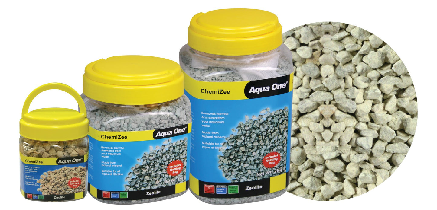 Aqua One ChemiZee is a natural mineral that is highly porous, allowing water to pass through the stone, where a chemical exchange takes place. Highly charged ions from the zeolite exchange with ammonia in the water, resulting in the removal of this ammonia from the water.
